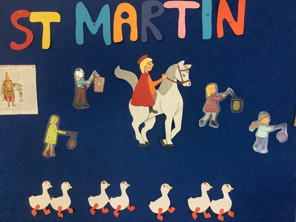 Der Martinstag startete am Vormittag mit einem Theaterstück in unserer Pausenhalle. Hier führten die Klasse 3c und 3 d mit Frau Gatzmenga die Legende über Sankt Martin für die 1. und 2. Klassen auf.