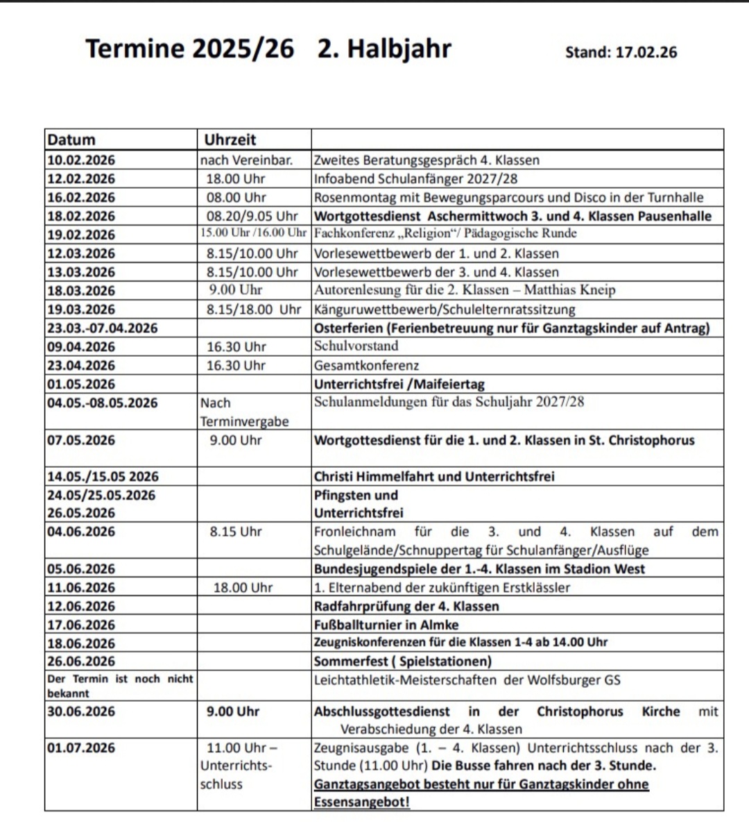 Im Sekretariat der Schule (05361/848849) können Sie sich gerne bei Frau Stierl (07:30-11:45 Uhr) einen Termin für die Anmeldephase vom 04.05 – 08.05.2026 geben lassen.